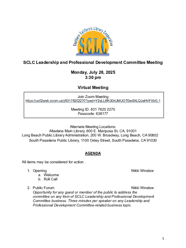 SCLC Leadership and Professional Development Committee Meeting Monday, July 28, 2025 3:30 pm Virtual Meeting Join Zoom Meetinghttps://us02web.zoom.us/j/83176202270?pwdY2sLL6fh3D4JMUOTDw9XLQJaHVFXbG.1Meeting