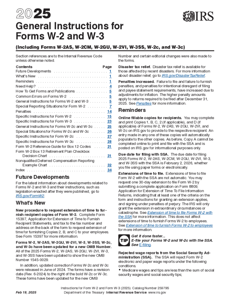 IRS Instruction W-2 & W-3 2025-2026 free printable template
