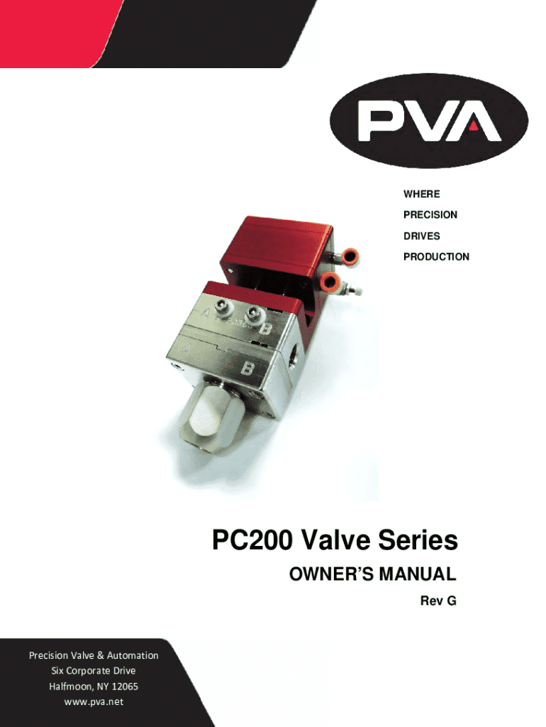 WHERE PRECISION DRIVES PRODUCTIONPC200 Valve Series OWNERS MANUAL Rev GPrecision Valve & Automation Six Corporate Drive Halfmoon, NY 12065 www.pva.netPC200 PVAThis document is based on information