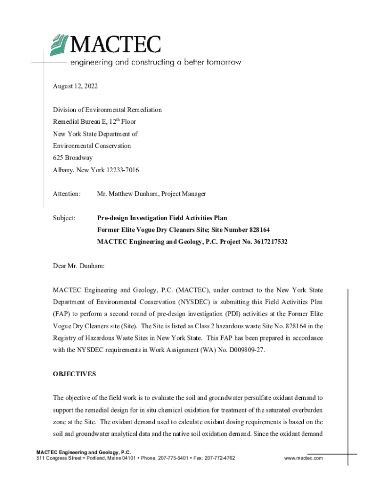 August 12, 2022 Division of Environmental Remediation Remedial Bureau E, 12th Floor New York State Department of Environmental Conservation 625 Broadway Albany, New York 122337016 Attention:Mr. Matthew