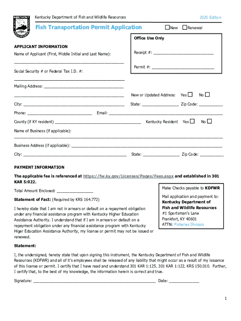 Kentucky Department of Fish and Wildlife Resources2025 EditionFish Transportation Permit ApplicationNewRenewalOffice Use Only APPLICANT INFORMATION Name of Applicant (First, Middle Initial and Last