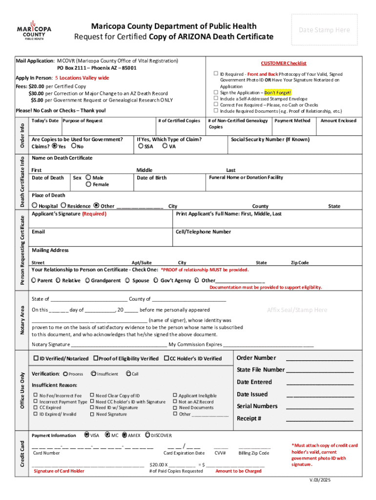 Get the free Maricopa County Public Health Request for Certifiied Copy of Arizona Death Certificate