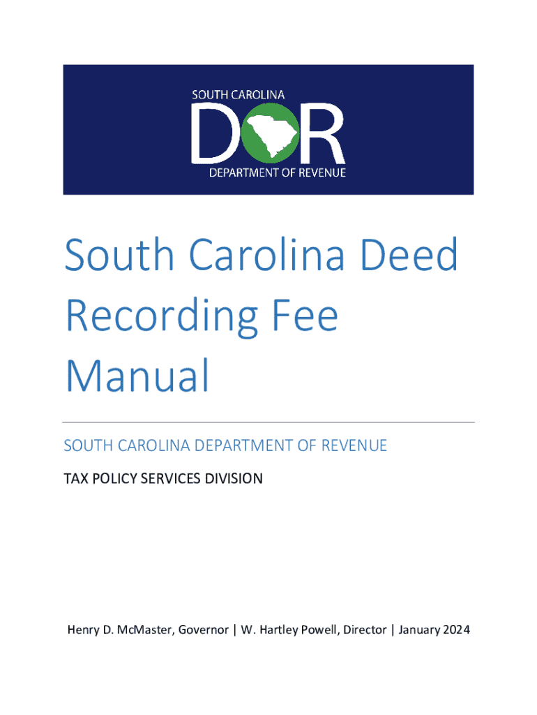 South Carolina Deed Recording Fee Manual SOUTH CAROLINA DEPARTMENT OF REVENUE TAX POLICY SERVICES DIVISIONHenry D. McMaster, Governor | W. Hartley Powell, Director | January 2024SOUTH CAROLINADOR