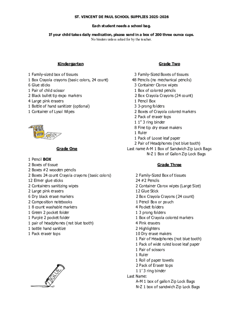 ST. VINCENT DE PAUL SCHOOL SUPPLIES 20252026 Each student needs a school bag. If your child takes daily medication, please send in a box of 200 three ounce cups. No binders unless asked for by the