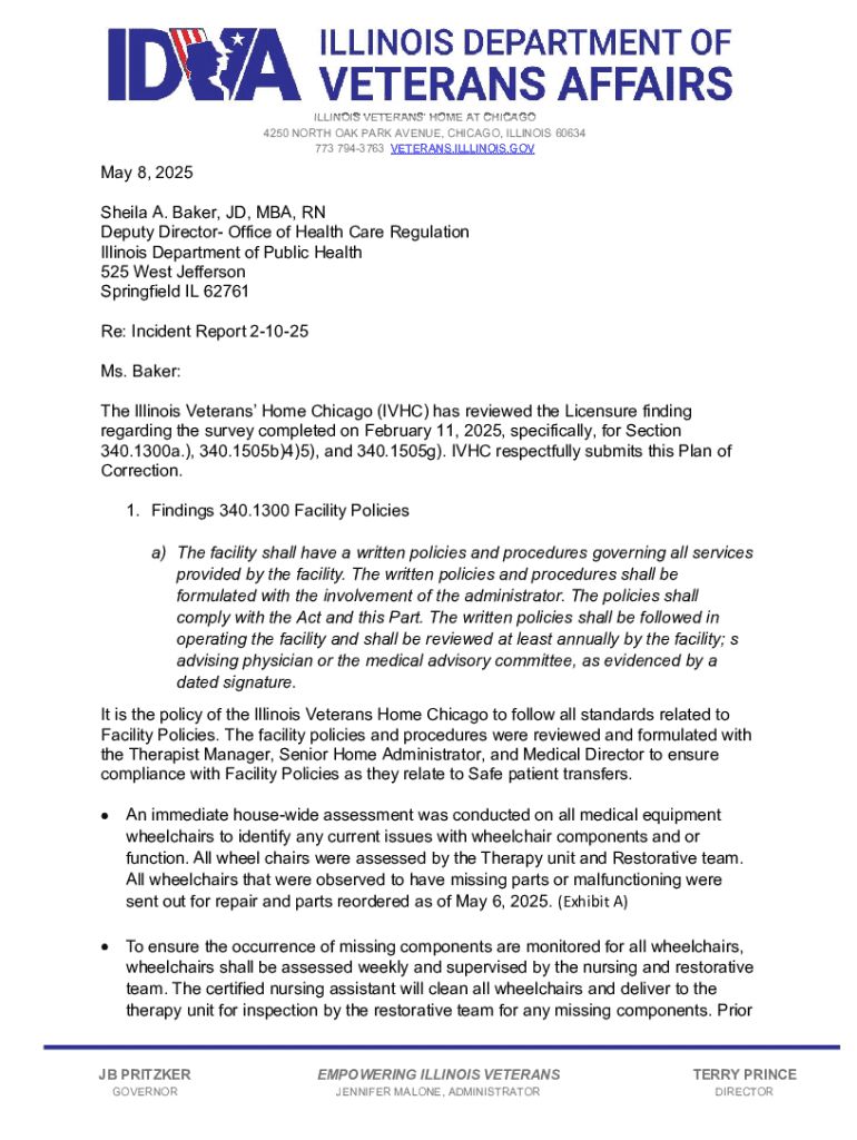 ILLINOIS VETERANS HOME AT CHICAGO 4250 NORTH OAK PARK AVENUE, CHICAGO, ILLINOIS 60634 773 7943763 VETERANS.ILLLINOIS.GOVMay 8, 2025 Sheila A. Baker, JD, MBA, RN Deputy Director Office of Health Care