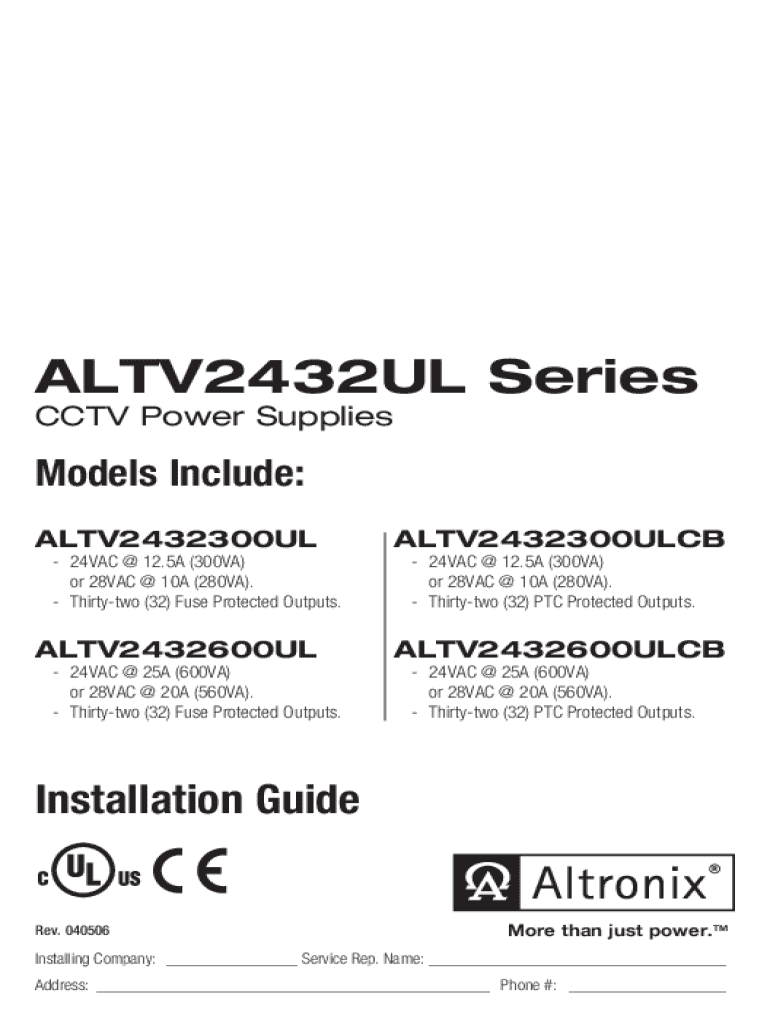 ALTV2432UL Series CCTV Power SuppliesModels Include: ALTV2432300ULALTV2432300ULCBALTV2432600ULALTV2432600ULCB 24VAC @ 12.5A (300VA)or 28VAC @ 10A (280VA).Thirtytwo (32) Fuse Protected Outputs. 24VAC