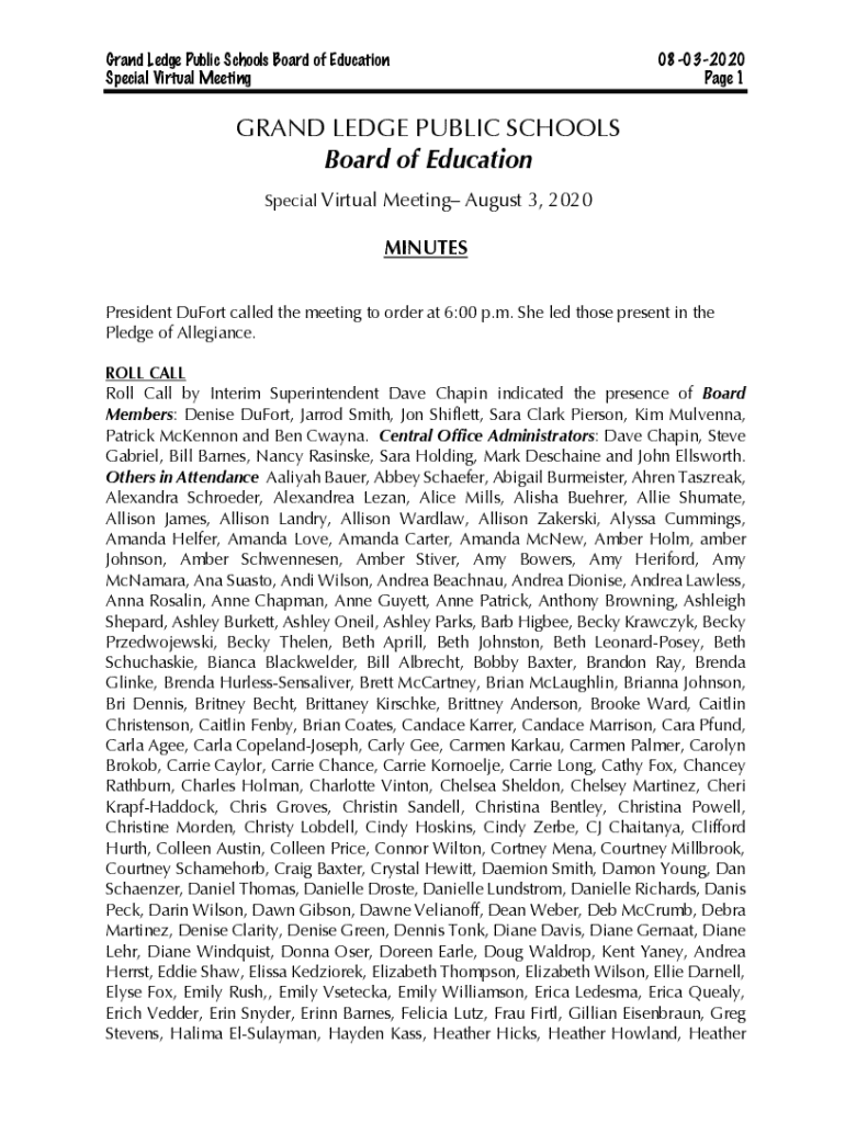 Grand Ledge Public Schools Board of Education Special Virtual Meeting08032020 Page 1GRAND LEDGE PUBLIC SCHOOLS Board of Education Special Virtual Meeting August 3, 2020MINUTES President DuFort called