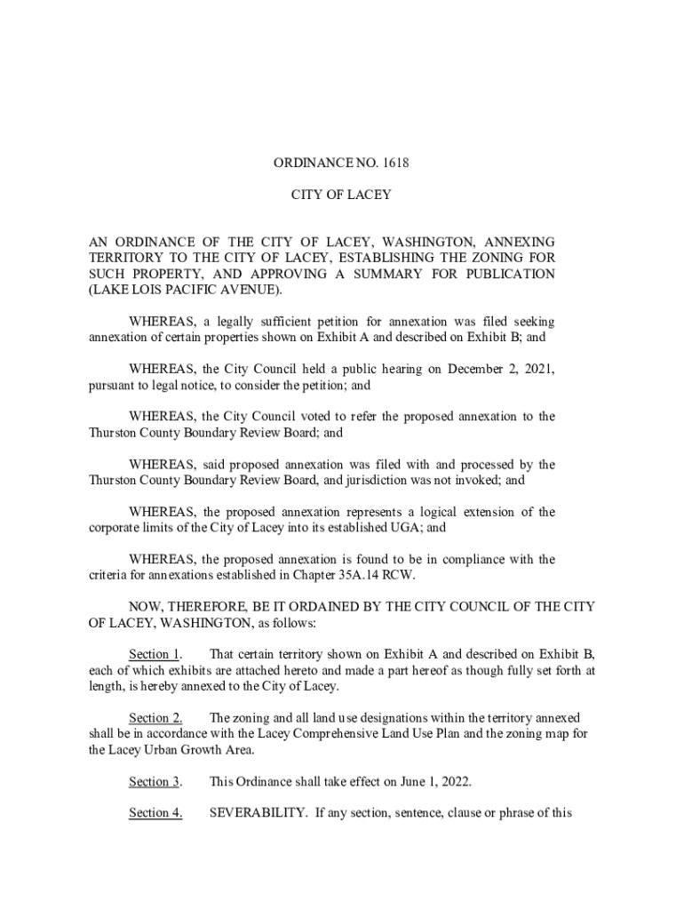 ORDINANCE NO. 1618 CITY OF LACEY AN ORDINANCE OF THE CITY OF LACEY, WASHINGTON, ANNEXING TERRITORY TO THE CITY OF LACEY, ESTABLISHING THE ZONING FOR SUCH PROPERTY, AND APPROVING A SUMMARY FOR PUBLICATION