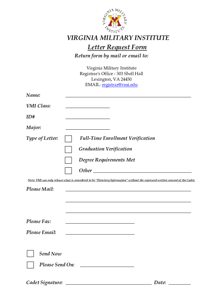 The Virginia Military Institute (VMI), established in 1839, is one of the oldest military academies in the United States. Located in Lexington, Virginia, VMI has a rich history of producing distinguished military leaders and is well regarded for its rigorous academic programs and strong military training. The VMI Letter Form plays a critical role within the institute's administrative framework, serving as a standardized communication tool for various processes including admissions, academic programs, and official military correspondence.