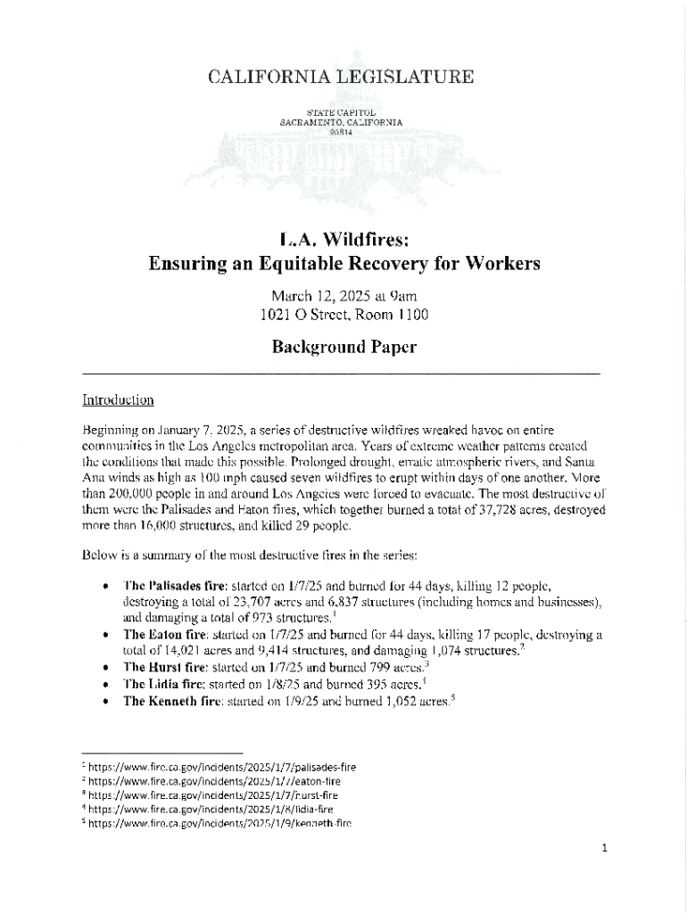 CALIFORNIA LEGISLATURE STATE CAPITOL SACRAMENTO, CALIFORNIA 95814L.A. Wildfires: Ensuring an Equitable Recovery for Workers March 12, 2025 at 9am 1021 O Street, Room 1100Background Paper IntroductionBeginning