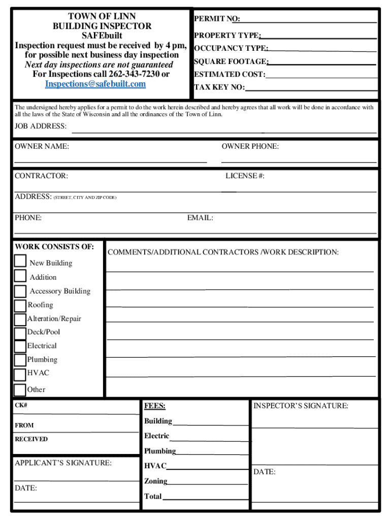 Various forms are essential for the building permit and inspection process. The building permit application form is arguably the most significant document, as it initiates the permitting process. Additionally, an inspection request form is required to schedule necessary inspections of the construction.