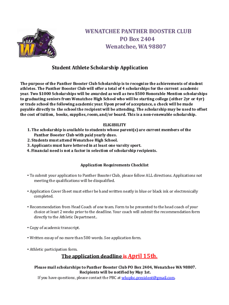 WENATCHEE PANTHER BOOSTER CLUB PO Box 2404 Wenatchee, WA 98807 Student Athlete Scholarship Application The purpose of the Panther Booster Club Scholarship is to recognize the achievements of student