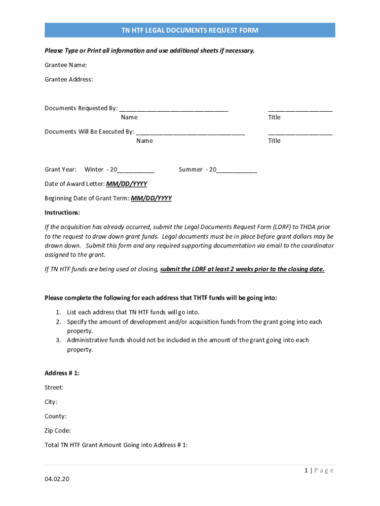 TN HTF LEGAL DOCUMENTS REQUEST FORM Please Type or Print all information and use additional sheets if necessary. Grantee Name: Grantee Address:Documents Requested By: ___ Name___ TitleDocuments Will