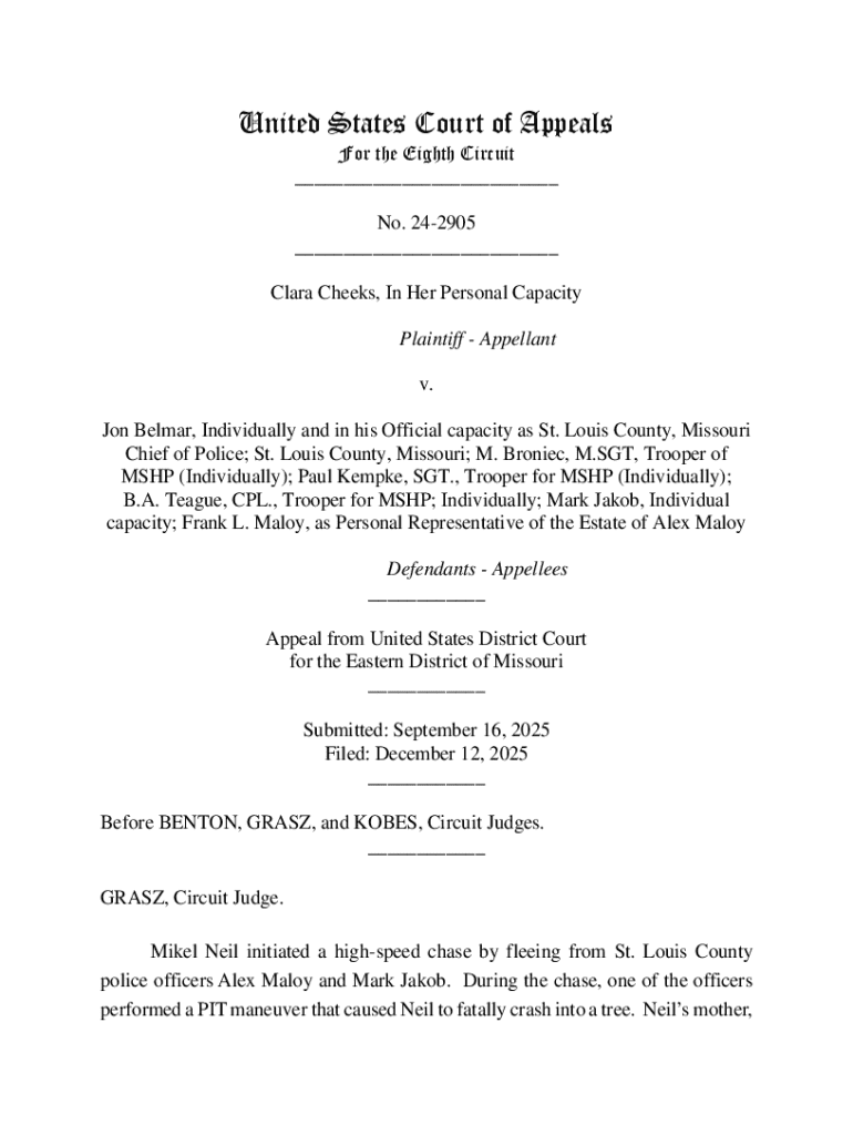 United States Court of Appeals For the Eighth Circuit ___ No. 242905 ___ Clara Cheeks, In Her Personal Capacity PlaintiffAppellant v. Jon Belmar, Individually and in his Official capacity as St. Louis