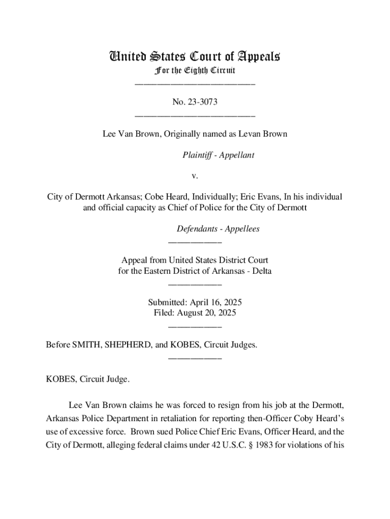 United States Court of Appeals For the Eighth Circuit ___ No. 233073 ___ Lee Van Brown, Originally named as Levan Brown PlaintiffAppellant v. City of Dermott Arkansas; Cobe Heard, Individually; Eric