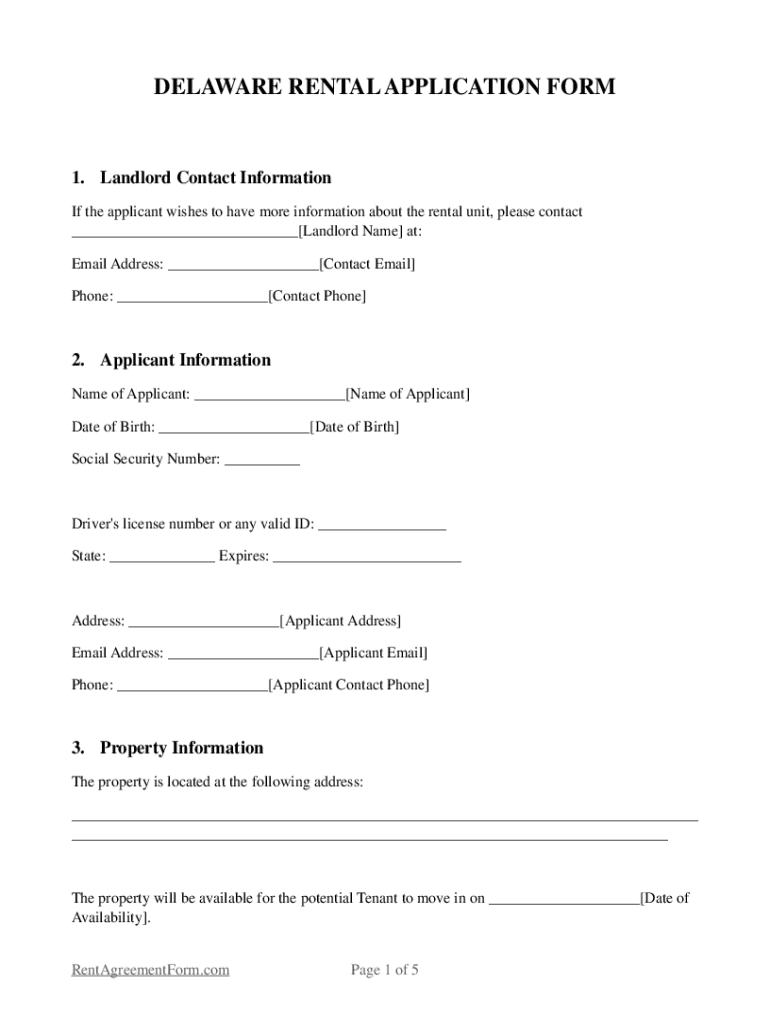 DELAWARE RENTAL APPLICATION FORM1. Landlord Contact Information If the applicant wishes to have more information about the rental unit, please contact ___[Landlord Name] at: Email Address: ___[Contact