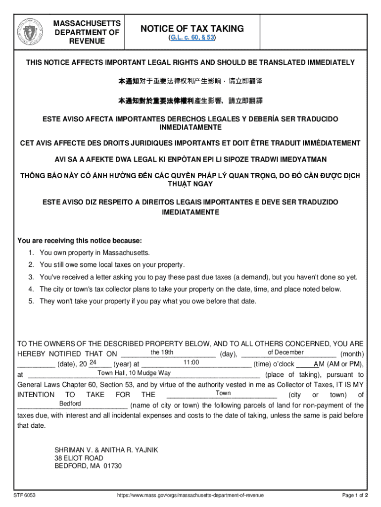 Get the free NOTICE OF TAX TAKING - (GL c. 60,53)