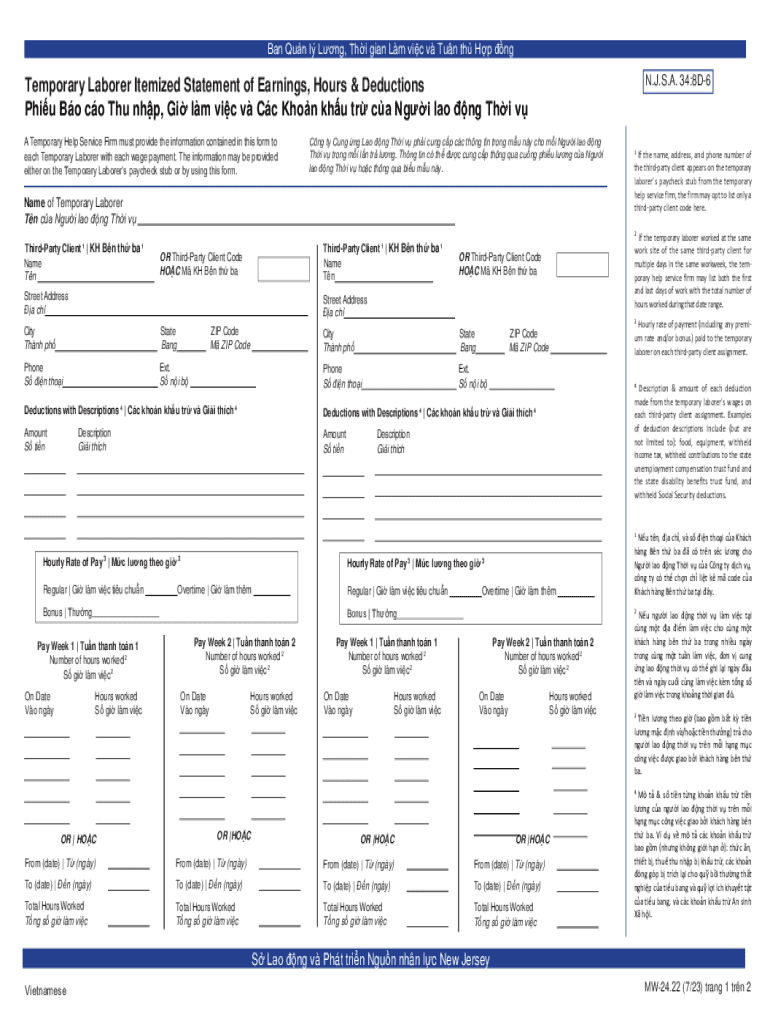 Ban Qun l Lng, Thi gian Lm vic v Tun th Hp ng N.J.S.A. 34:8D6Temporary Laborer Itemized Statement of Earnings, Hours & Deductions Phiu Bo co Thu nhp, Gi lm vic v Cc Khon khu tr ca Ngi lao ng Thi v