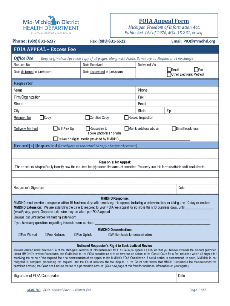 FOIA Appeal FormMichigan Freedom of Information Act, Public Act 442 of 1976, MCL 15.231, et seq. Phone: (989) 8315237Fax: (989) 8315522Email: PIO@mmdhd.orgFOIA APPEALExcess Fee Office UseKeep original