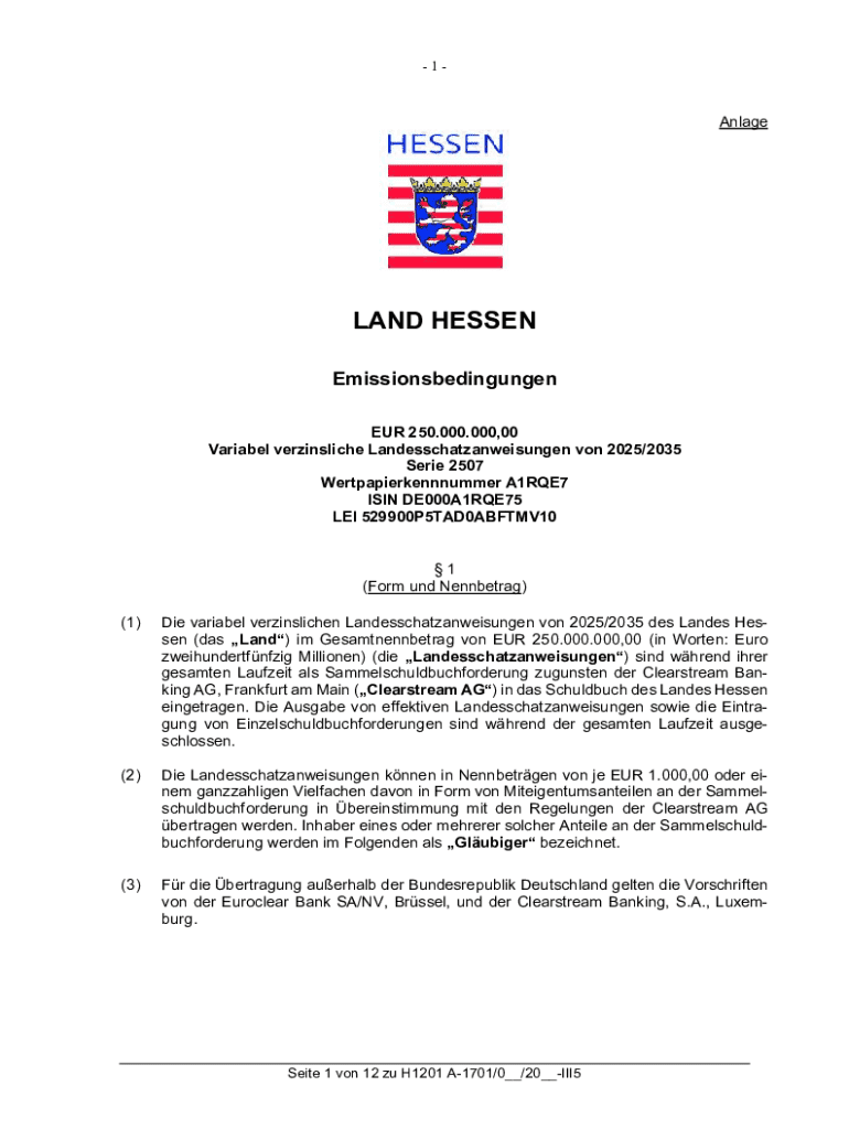 1AnlageLAND HESSEN Emissionsbedingungen EUR 250.000.000,00 Variabel verzinsliche Landesschatzanweisungen von 2025/2035 Serie 2507 Wertpapierkennnummer A1RQE7 ISIN DE000A1RQE75 LEI 529900P5TAD0ABFTMV10