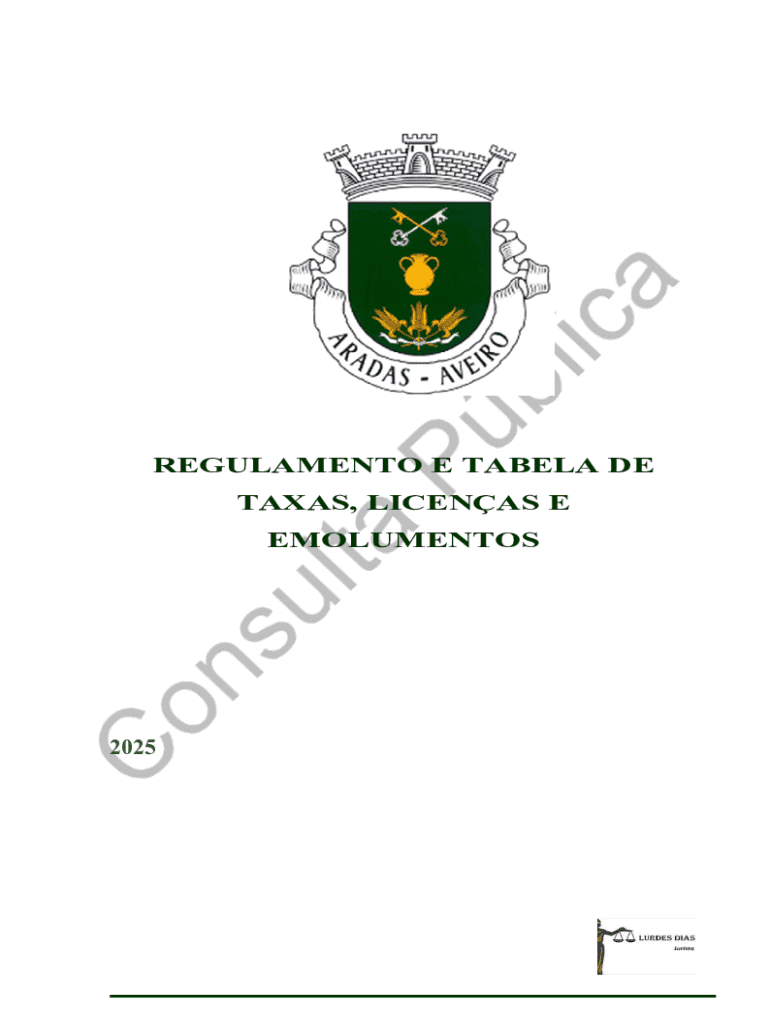 REGULAMENTO E TABELA DE TAXAS, LICENAS E EMOLUMENTOS2025Regulamento e Tabela de Taxas, Licenas e EmolumentosFreguesia de Aradas Largo Accio Rosa | Verdemilho | 3810604 Aveiro | Telf. 234 426 751 |
