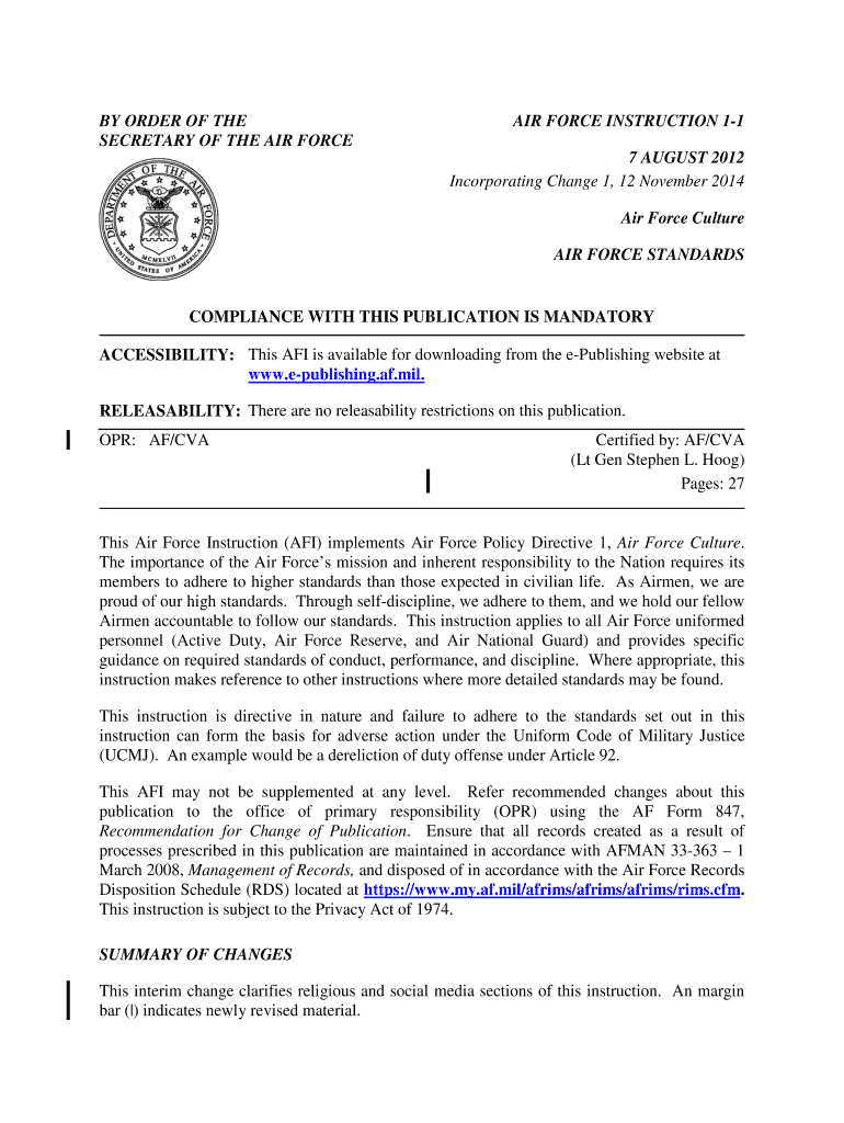 BY ORDER OF THE SECRETARY OF THE AIR FORCE INSTRUCTION 1-1 7 AUGUST 2012 Incorporating Change 1, 12 November 2014 Air Force Culture AIR FORCE STANDARDS COMPLIANCE WITH THIS PUBLICATION IS MANDATORY