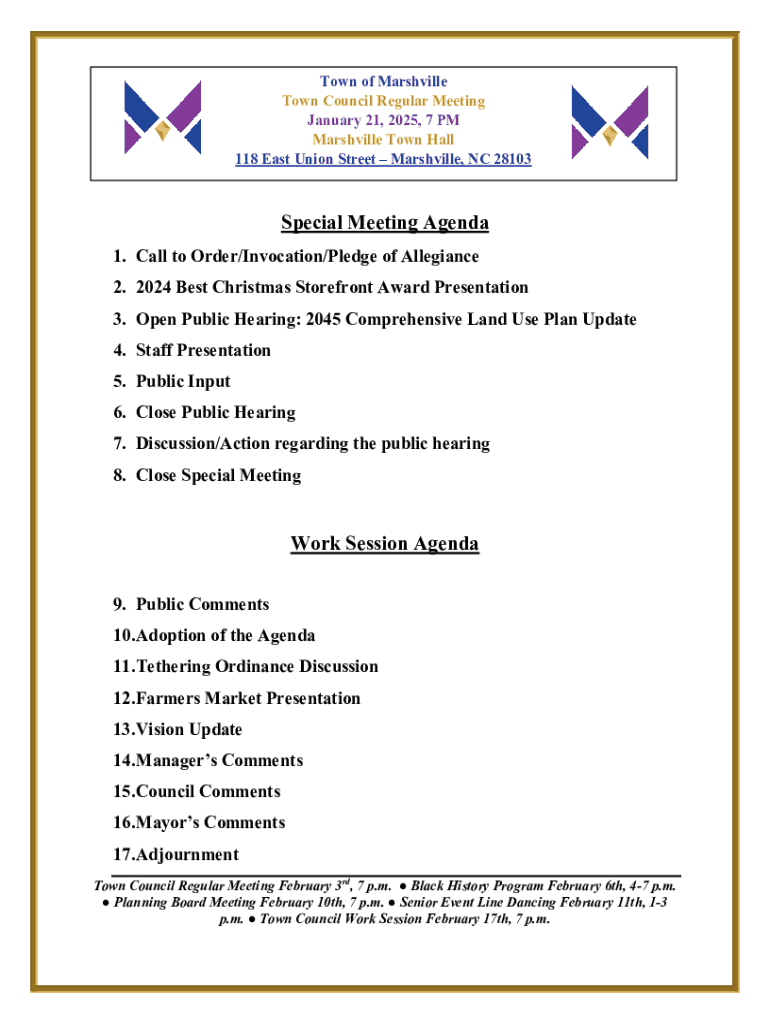 Town of Marshville Town Council Regular Meeting January 21, 2025, 7 PM Marshville Town Hall 118 East Union StreetMarshville, NC 28103Special Meeting Agenda 1. Call to Order/Invocation/Pledge of Allegiance