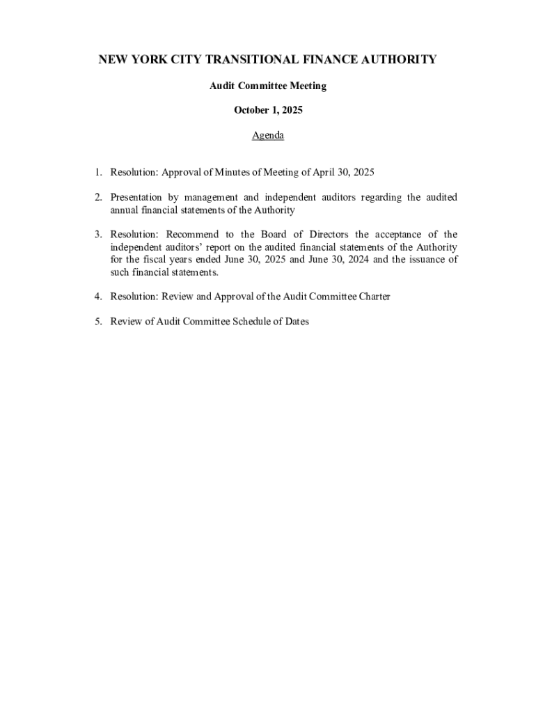 NEW YORK CITY TRANSITIONAL FINANCE AUTHORITY Audit Committee Meeting October 1, 2025 Agenda 1. Resolution: Approval of Minutes of Meeting of April 30, 2025 2. Presentation by management and independent