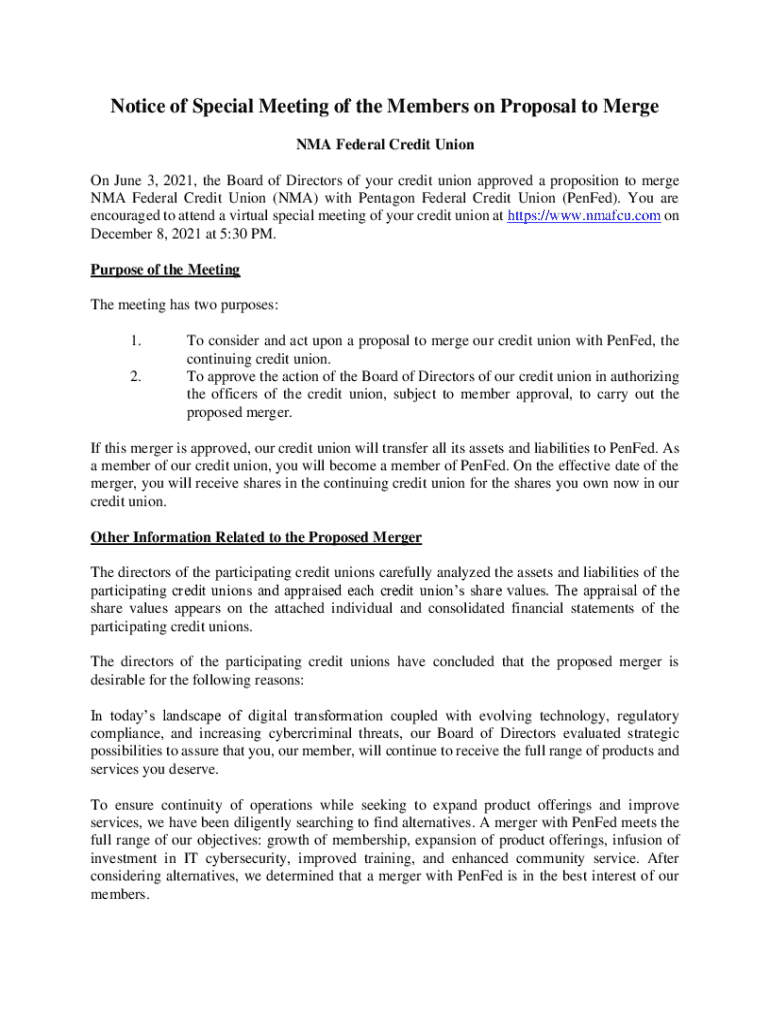 Notice of Special Meeting of the Members on Proposal to Merge NMA Federal Credit Union On June 3, 2021, the Board of Directors of your credit union approved a proposition to merge NMA Federal Credit