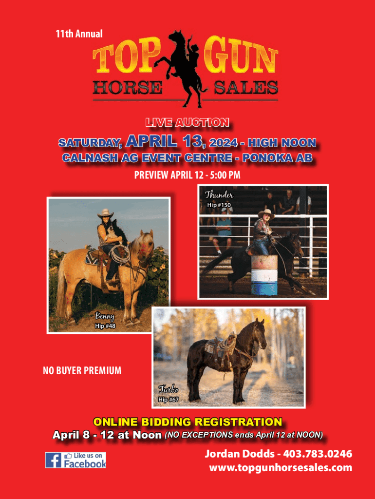 11th AnnualLIVE AUCTIONSATURDAY, APRIL 13, 2024HIGH NOON CALNASH AG EVENT CENTREPONOKA ABPREVIEW APRIL 125:00 PM Thunder Hip #150BennyHip #48NO BUYER PREMIUM TurboHip #67ONLINE BIDDING REGISTRATION