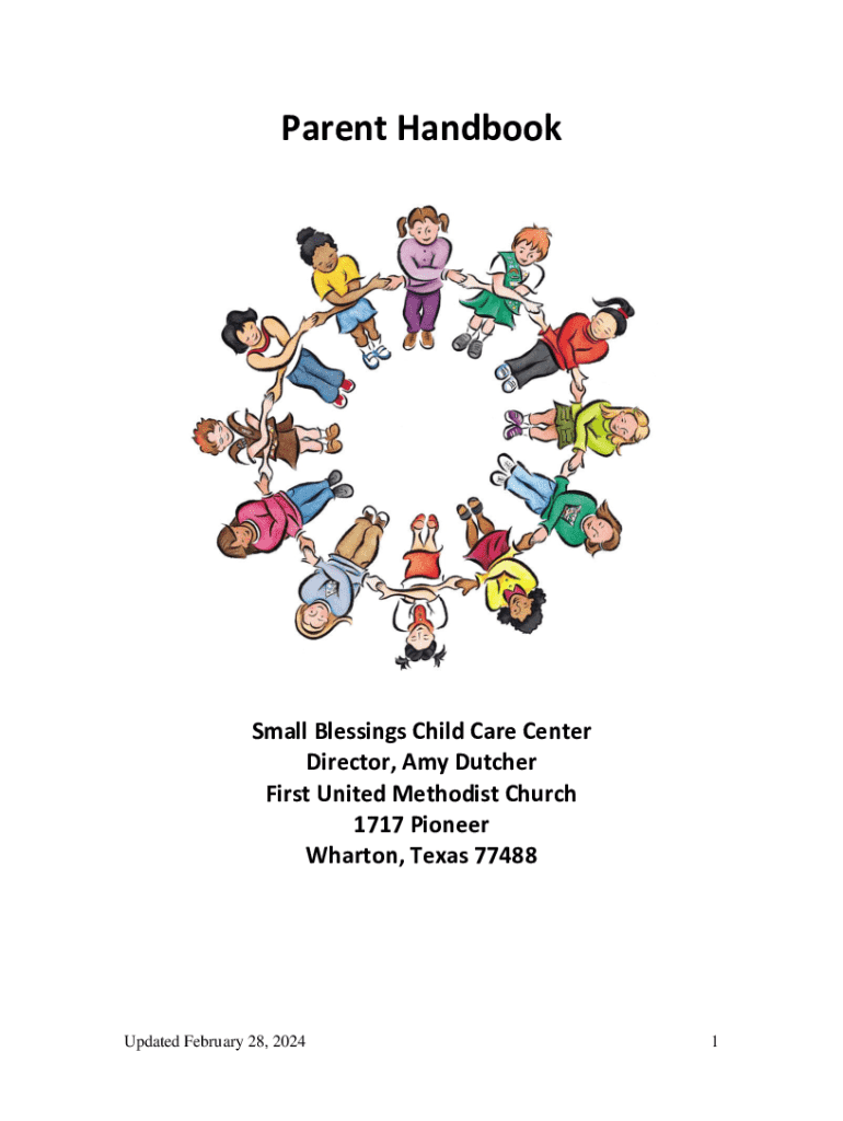 Parent HandbookSmall Blessings Child Care Center Director, Amy Dutcher First United Methodist Church 1717 Pioneer Wharton, Texas 77488Updated February 28, 20241Updated February 28, 20242PURPOSE Small