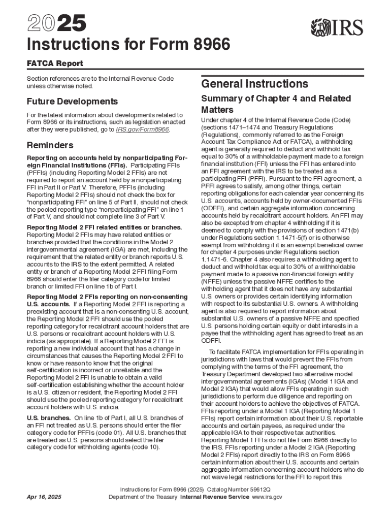 2025Instructions for Form 8966 FATCA Report Section references are to the Internal Revenue Code unless otherwise noted.General InstructionsFuture DevelopmentsSummary of Chapter 4 and Related MattersFor