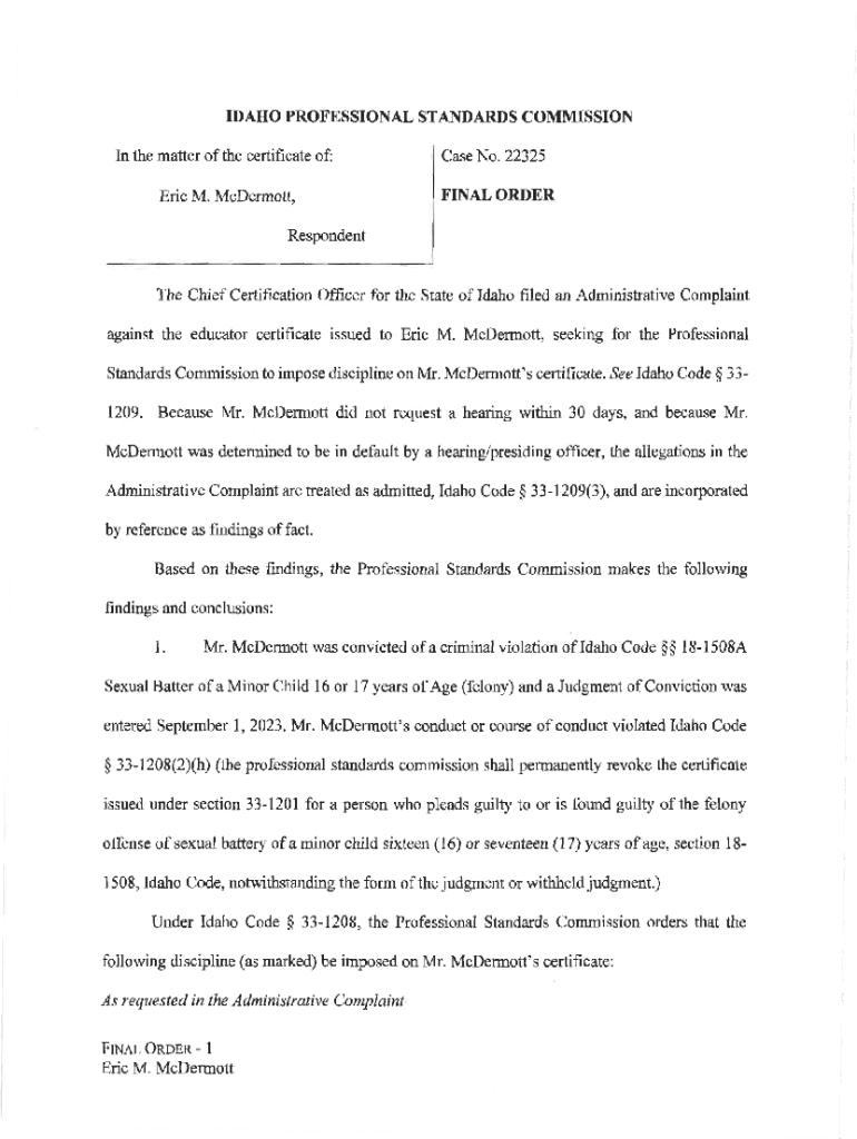 IDAHO PROFESSIONAL STANDARDS COMMISSIONIn the matter of the certificate of:Case No. 22325Eric M. McDermott,FINAL ORDERRespondent The Chief Certification Officer for the State of Idaho filed an Administrative