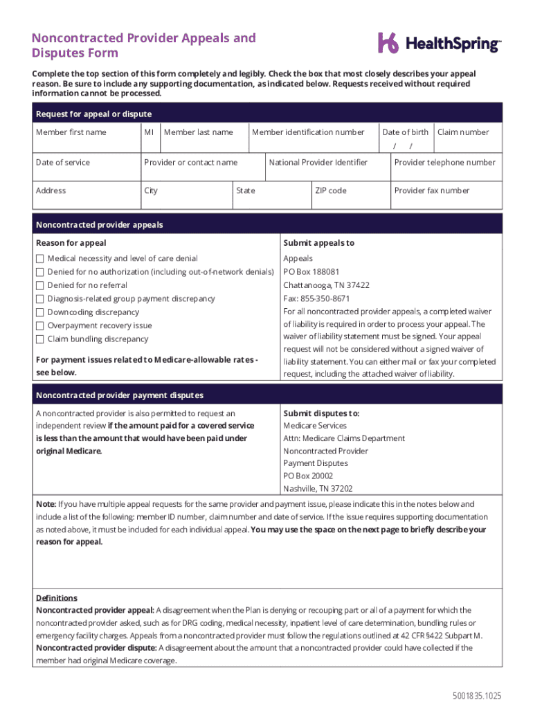 Noncontracted Provider Appeals and Disputes Form Complete the top section of this form completely and legibly. Check the box that most closely describes your appeal reason. Be sure to include any
