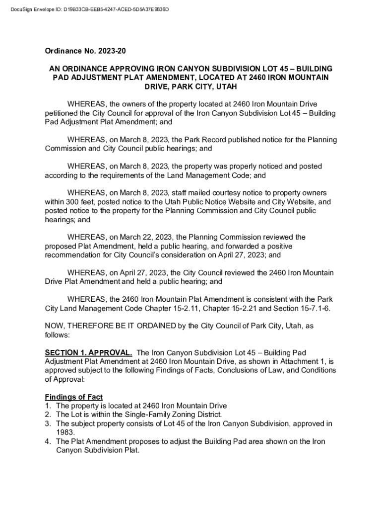 DocuSign Envelope ID: D19B33CBEEB54247ACED5D5A37E9836DOrdinance No. 202320 AN ORDINANCE APPROVING IRON CANYON SUBDIVISION LOT 45BUILDING PAD ADJUSTMENT PLAT AMENDMENT, LOCATED AT 2460 IRON MOUNTAIN