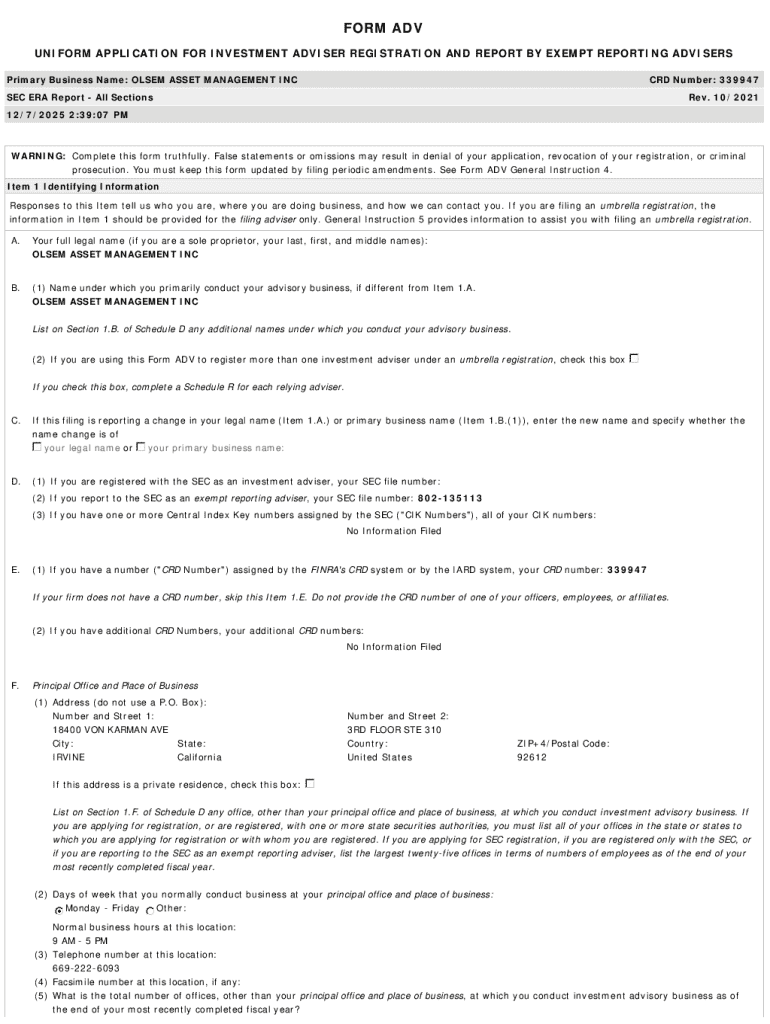 Detailed breakdown of the Olsem Asset Management Inc Form sections