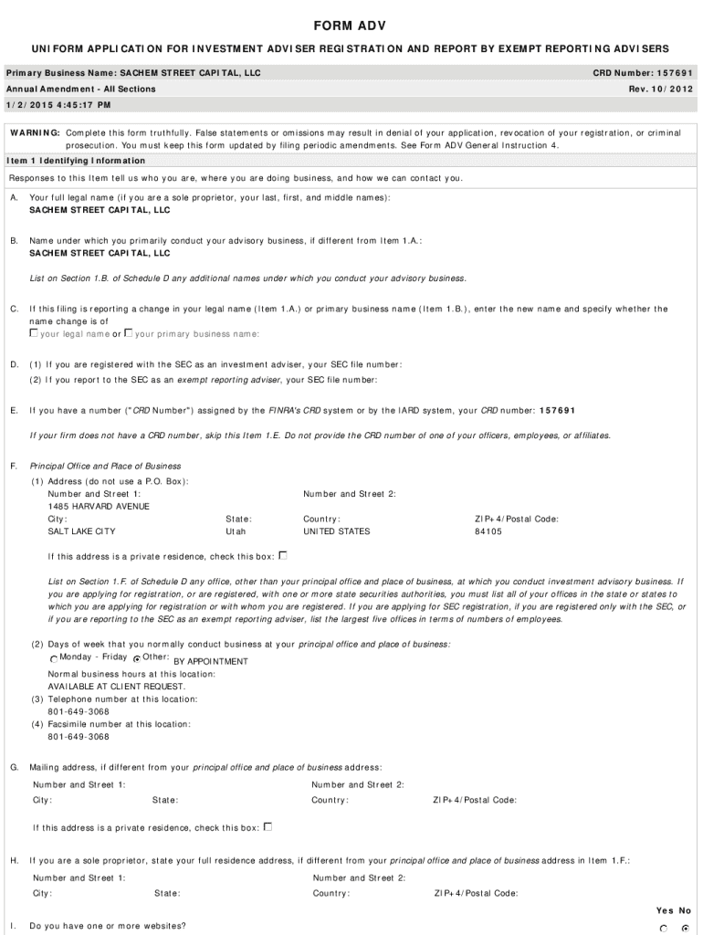 FORM ADV UNIFORM APPLICATION FOR INVESTMENT ADVISER REGISTRATION AND REPORT BY EXEMPT REPORTING ADVISERS Primary Business Name: SACHEM STREET CAPITAL, LLCCRD Number: 157691Annual AmendmentAll SectionsRev.