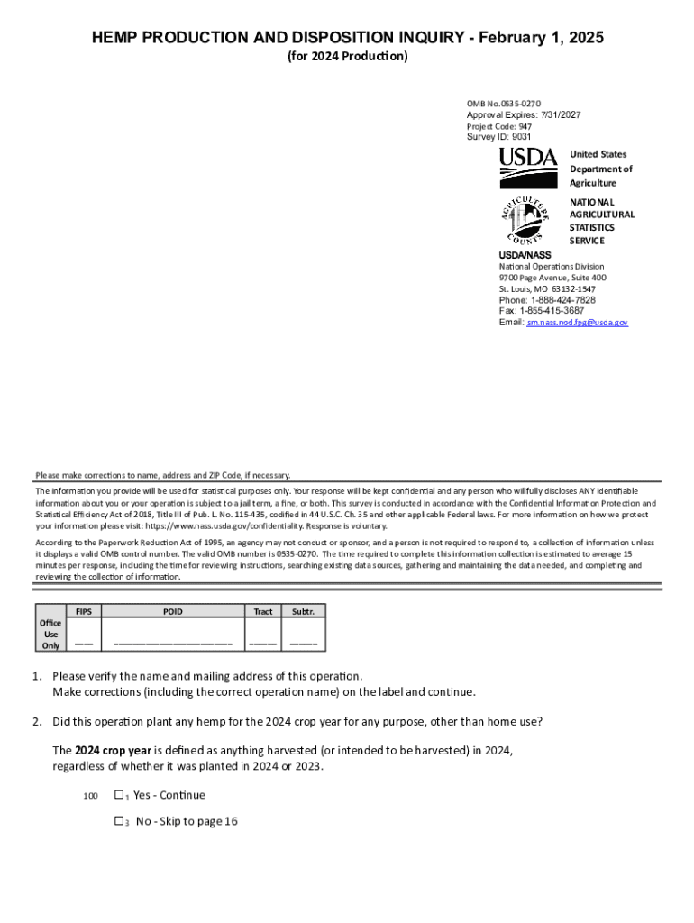 HEMP PRODUCTION AND DISPOSITION INQUIRYFebruary 1, 2025 (for 2024 Production) OMB No.05350270 Approval Expires: 7/31/2027 Project Code: 947 Survey ID: 9031United States Department of Agriculture NATIONAL