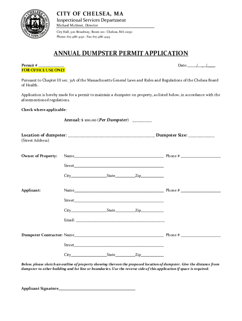 Completing the annual dumpster permit application form correctly is crucial for a smooth approval process. The form typically includes sections requiring personal information such as your name, address, and contact details, along with specifics about the project.
