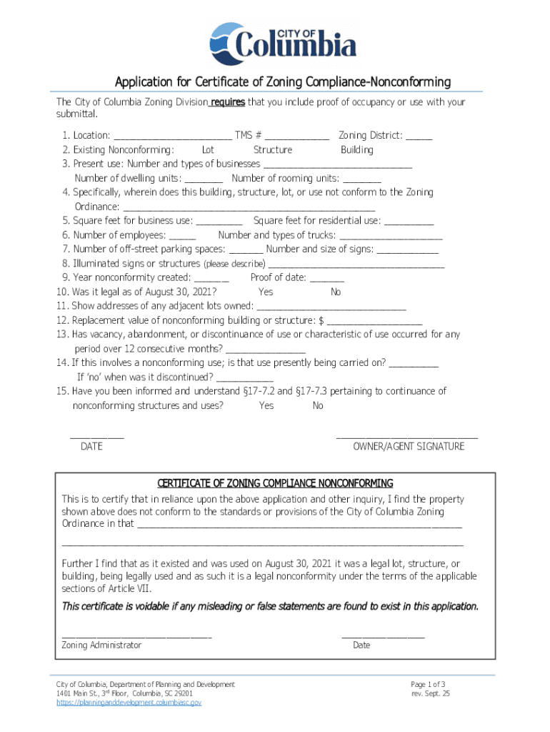 Application for Certificate of Zoning ComplianceNonconforming The City of Columbia Zoning Division requires that you include proof of occupancy or use with your submittal. 1. Location: ___ TMS # ___