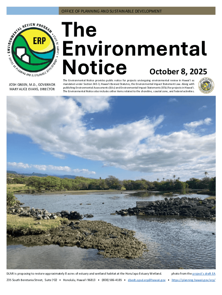 OFFICE OF PLANNING AND SUSTAINABLE DEVELOPMENTThe Environmental NoticeOctober 8, 2025JOSH GREEN, M.D., GOVERNOR MARY ALICE EVANS, DIRECTORThe Environmental Notice provides public notice for projects
