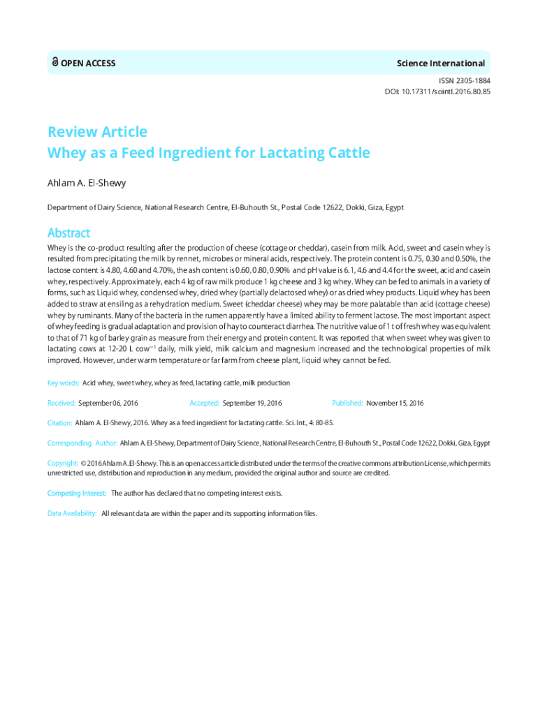 Get the free Whey as a Feed Ingredient for Lactating Cattle