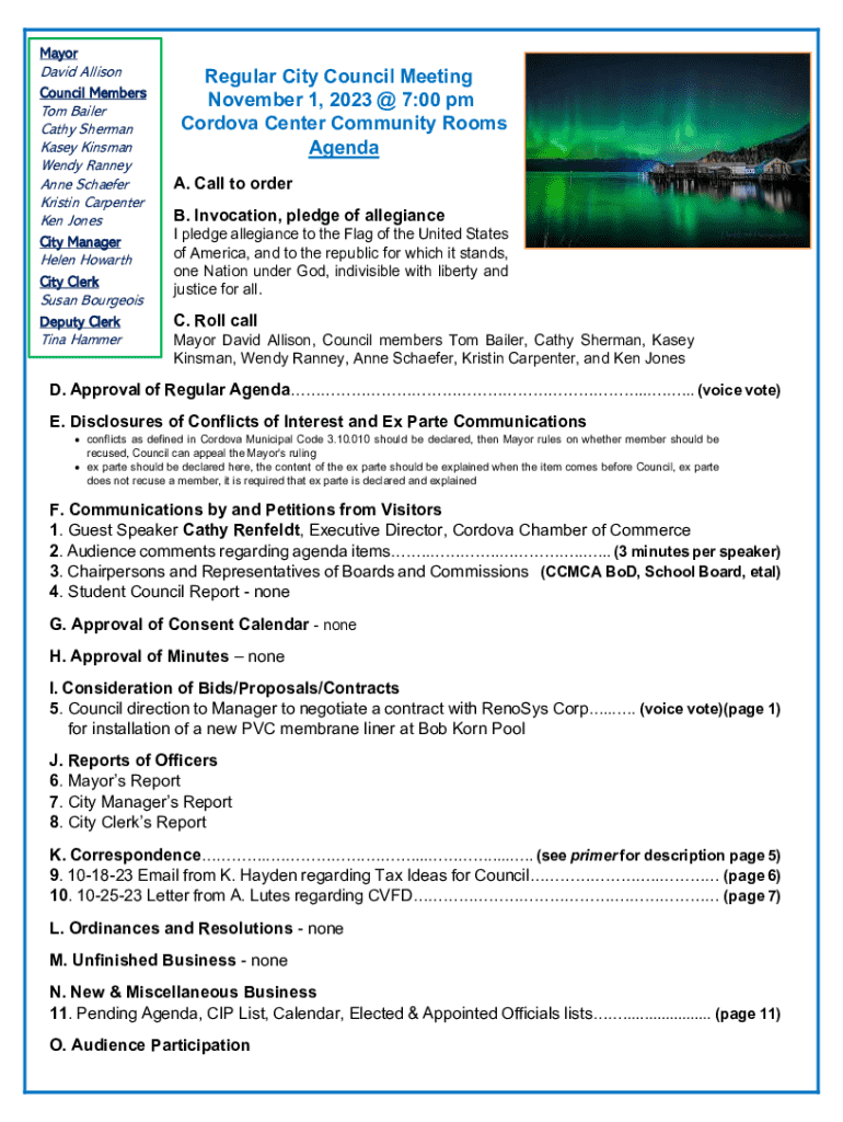 MayorDavid Allison Council MembersTom Bailer Cathy Sherman Kasey Kinsman Wendy Ranney Anne Schaefer Kristin Carpenter Ken Jones City ManagerHelen Howarth City ClerkSusan Bourgeois Deputy ClerkTina