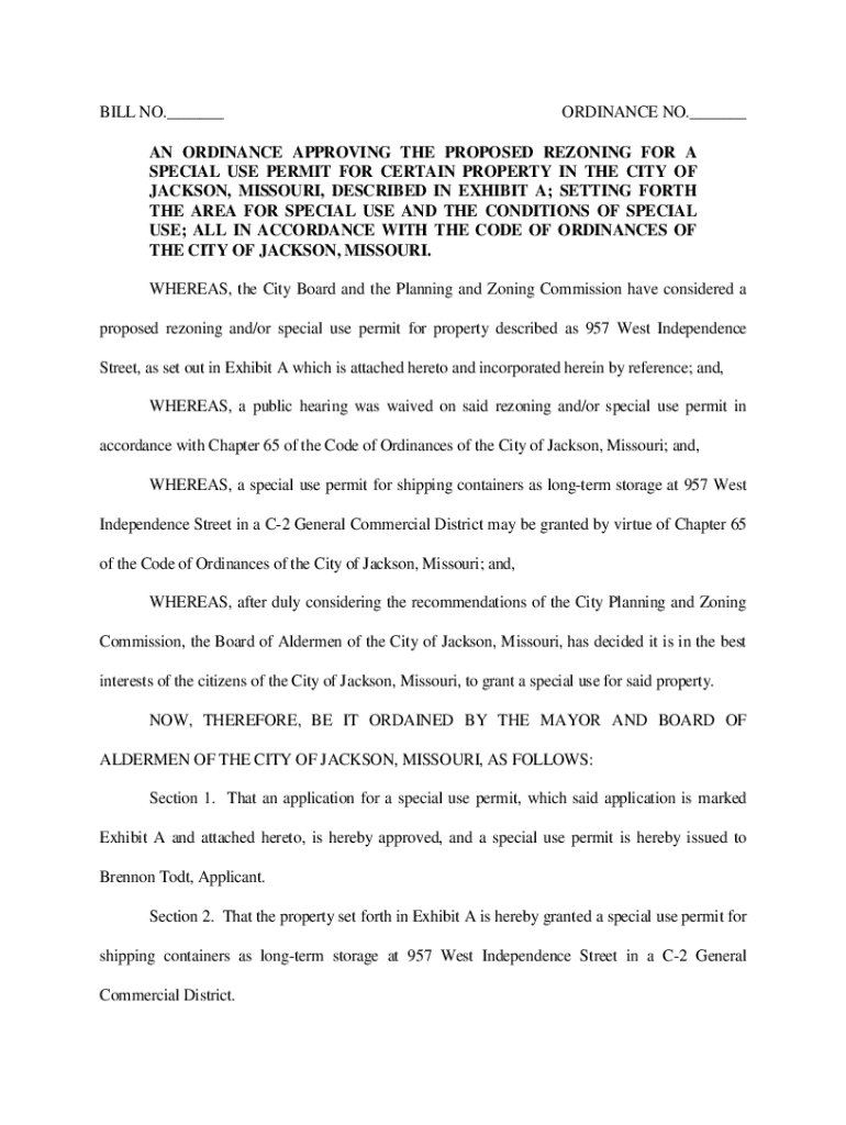 BILL NO.___ORDINANCE NO.___AN ORDINANCE APPROVING THE PROPOSED REZONING FOR A SPECIAL USE PERMIT FOR CERTAIN PROPERTY IN THE CITY OF JACKSON, MISSOURI, DESCRIBED IN EXHIBIT A; SETTING FORTH THE AREA