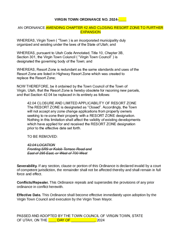 Get the free 1. an ordinance deleting chapter 42 resort zone from virgin