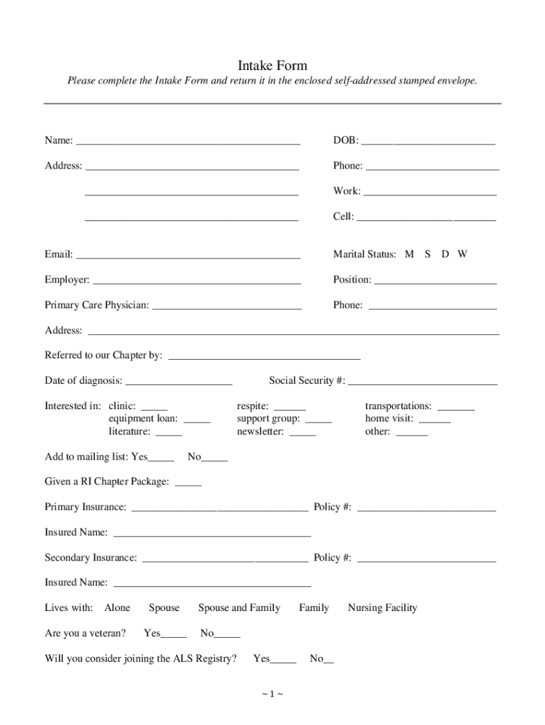 Intake Form Please complete the Intake Form and return it in the enclosed selfaddressed stamped envelope.Name: ___DOB: ___Address: ___Phone: ______Work: ______Cell: ___Email: ___Marital Status: MS