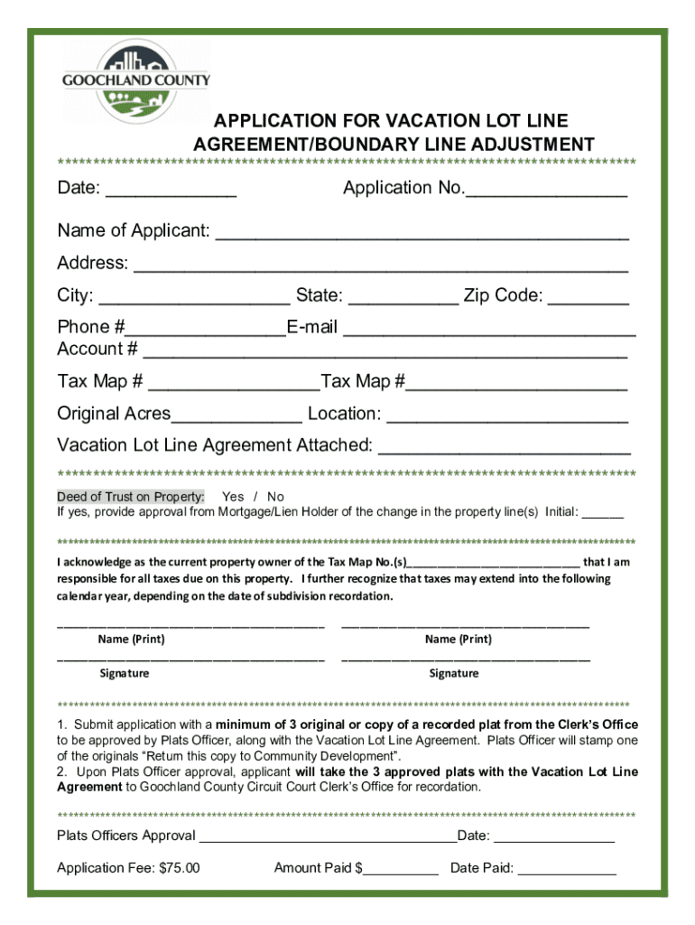 Get the free APPLICATION FOR VACATION LOT LINE AGREEMENT ...