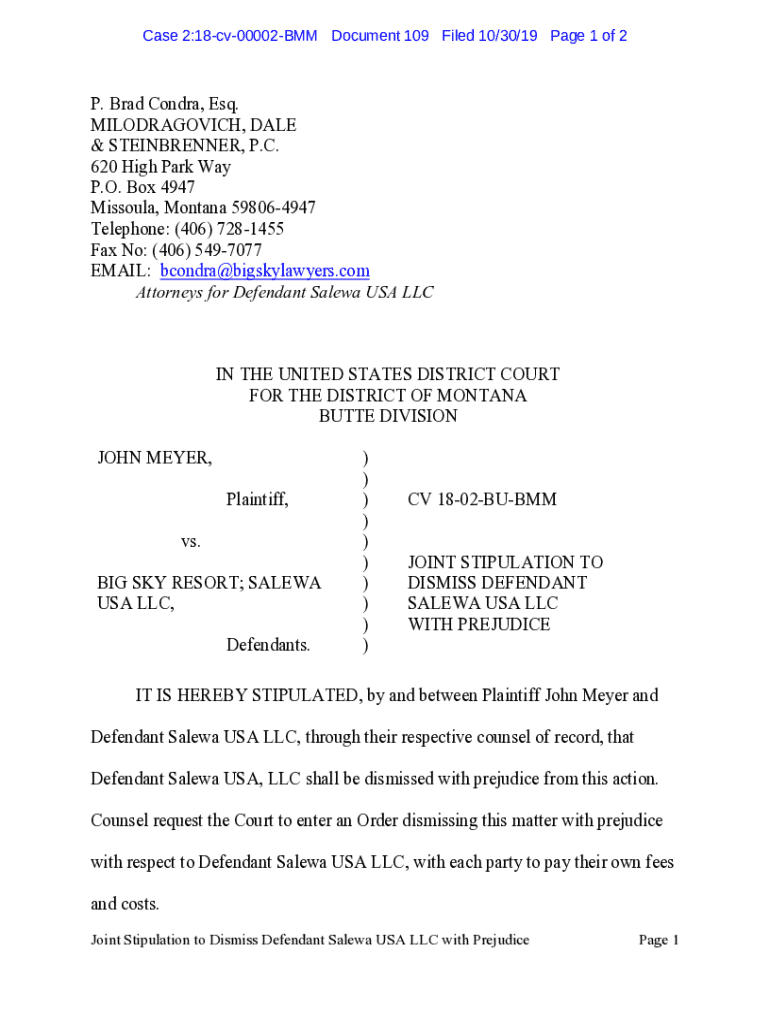 Case 2:18cv00002BMM Document 109 Filed 10/30/19 Page 1 of 2P. Brad Condra, Esq. MILODRAGOVICH, DALE & STEINBRENNER, P.C. 620 High Park Way P.O. Box 4947 Missoula, Montana 598064947 Telephone: (406)