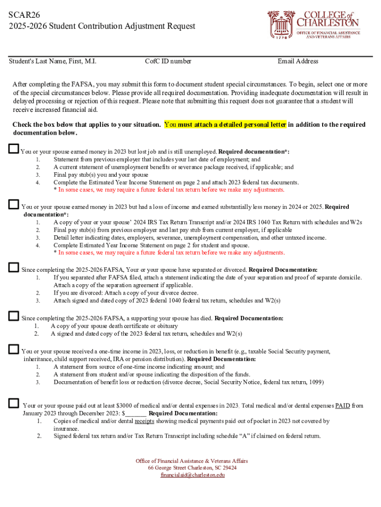 SCAR26 20252026 Student Contribution Adjustment RequestStudent\'s Last Name, First, M.I.CofC ID numberEmail AddressAfter completing the FAFSA, you may submit this form to document student special