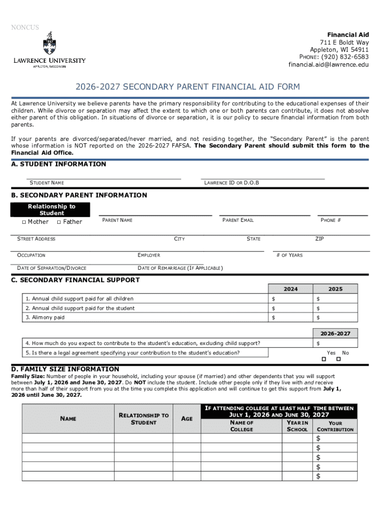 Get the free 2026-2027 Secondary Parent Financial Aid FormLawrence ...